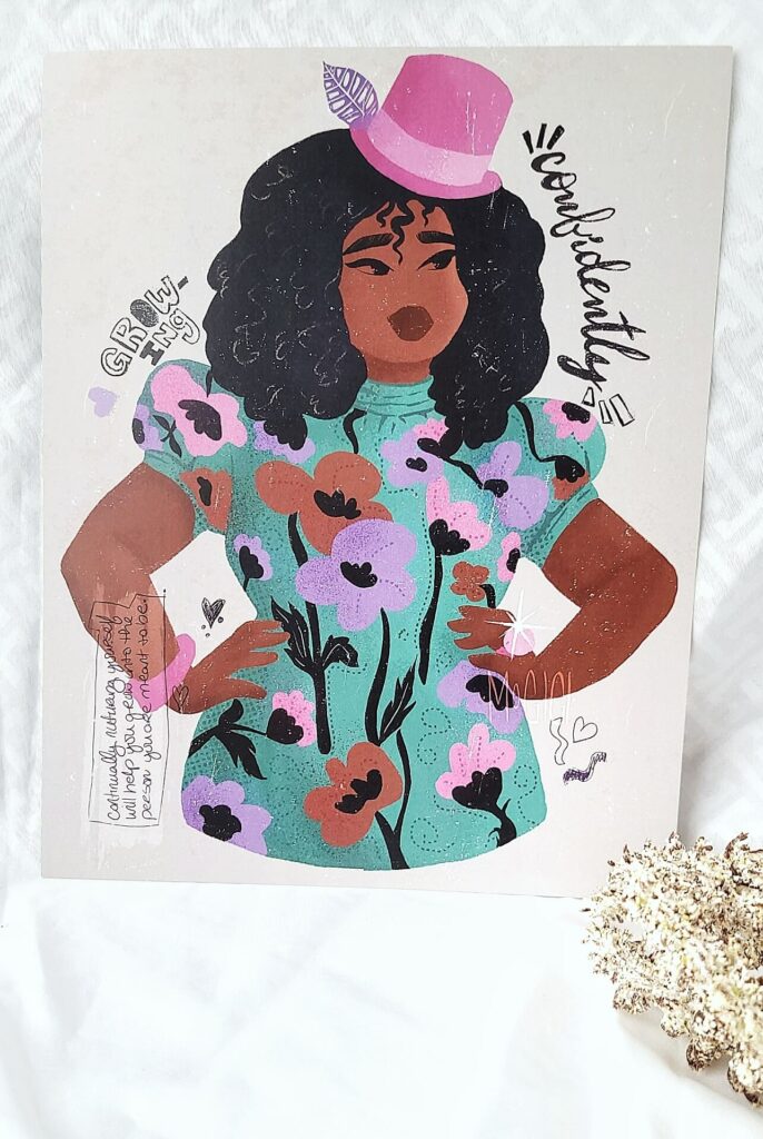 Growing Confidently, celebrates confidence in style with this stunning fashionista of a minimalist design. Her pose, along with the handwritten message gives a beautiful reminder that you can grow into your individual confidence.
